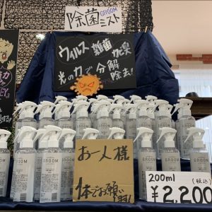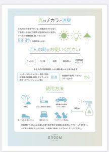除菌ミスト‘GROOM’!ウィルス、雑菌、カビ臭などを分解除去できるミストです!使い方はとても簡単♪気になるところや触る事が多い所にシュッシュとかけて”光”に当てる。光に当てるのがとても大事です!
